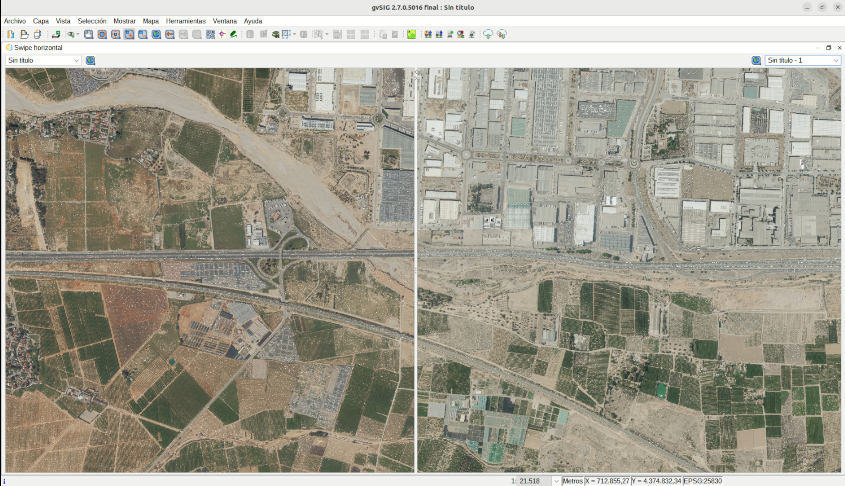La nueva versión gvSIG Desktop 2.7 incluye la herramienta de Swipe o Cortinilla. Con esta herramienta es posible comparar cartografía diferente de forma sencilla, como por ejemplo dos ortofotos de años diferentes.