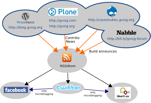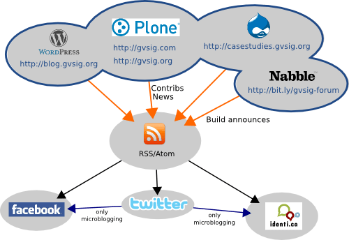 Next image shows the several information sources. We’re using now dlvr.it as a central way to spread the data in two configurations: one for the main sources (black arrows) and another one to post the microblogging posts that me and others write on gvSIG twitter account (blue arrows).