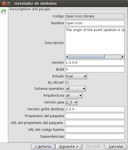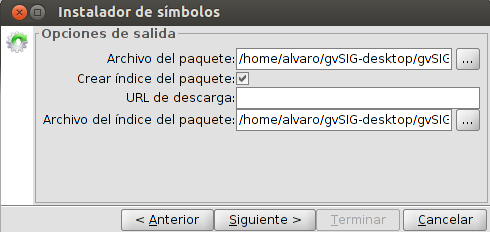 Y ahora debemos añadirle el nombre del paquete (que podéis copiar de la casilla “Archivo de paquete”). Por ejemplo, en nuestro caso en “Archivo de paquete” nos aparece:/home/alvaro/gvSIG-desktop/gvSIG-desktop-2.0.0/install/gvSIG-desktop-2.0.0-Open Icon Library-1.0.0-0-final-all-all-j1_5.gvspkg