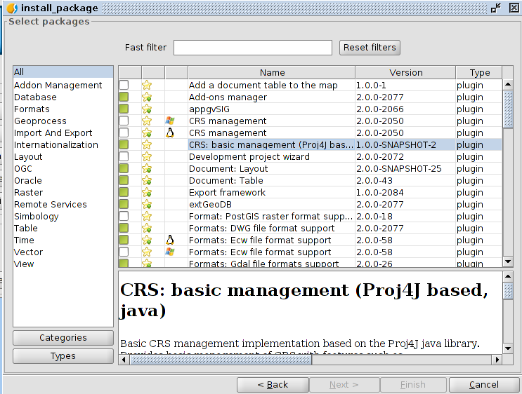 Alternatively it was developed a new CRS support, using for that purpose the Proj4J library, which is a partial implementation of Proj4 in Java language, and it is independent of the operative system in which gvSIG is installed.