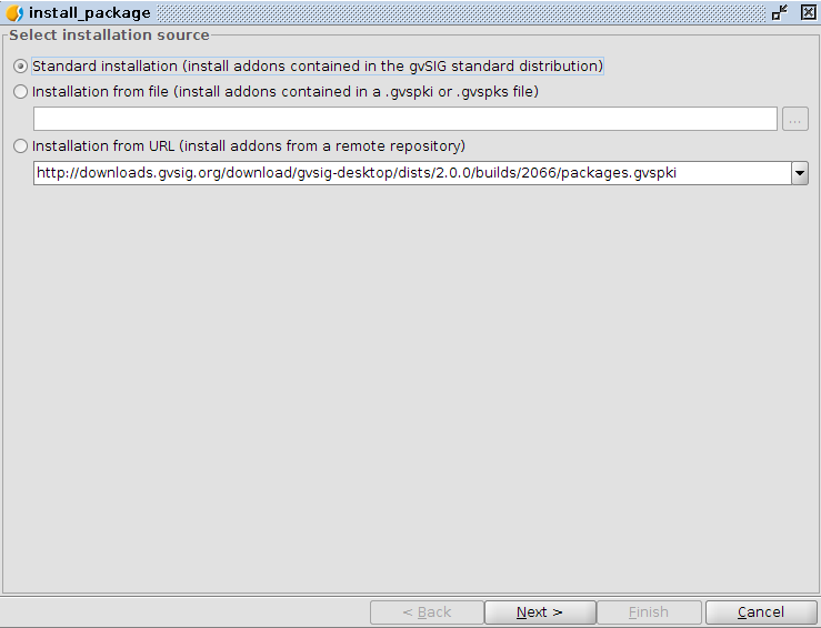 This option is available only if gvSIG has been setup from standard distribution, which allows to install only the add-ons already included; usually the most diffuse and stable add-ons are included. This option, thus, is the safer one because it should guarantee add-ons without fatal errors.