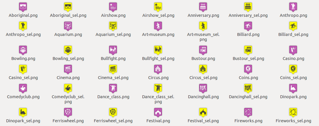 Para los símbolos puntuales (marcadores) hemos partido de la colección de símbolos realizada por Nicolas Mollet, denominada “Map Icons Collection”. Una excelente colección de símbolos por categorías, que además nos podemos descargar en formato PNG con diferentes estilos (classic, iOS, light,…). En nuestro caso hemos seleccionado el estilo por defecto.