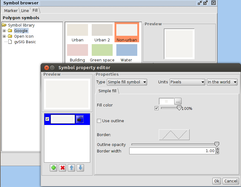 Queremos que esta biblioteca tenga además símbolos líneales y polígonales similares a los que podemos encontrar en Google Maps. Mediante cualquier editor de imágenes, como GIMP, podemos averiguar el RGB de estos símbolos y crear unos similares en gvSIG.