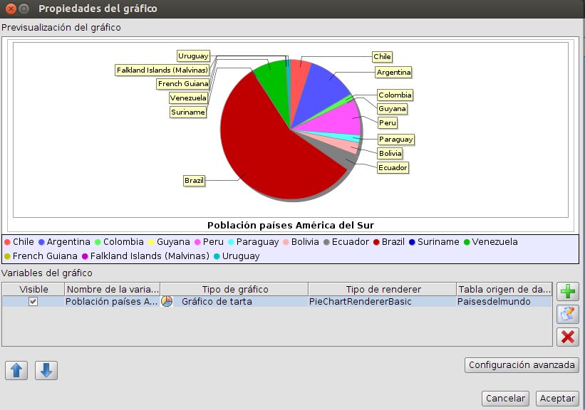 Vamos a hacer nuestra primera gráfica a partir de una tabla que contiene información de población de los países del mundo. Queremos hacer la gráfica sólo de los países de América del Sur, por lo que seleccionaremos estos antes de proceder a crearla.