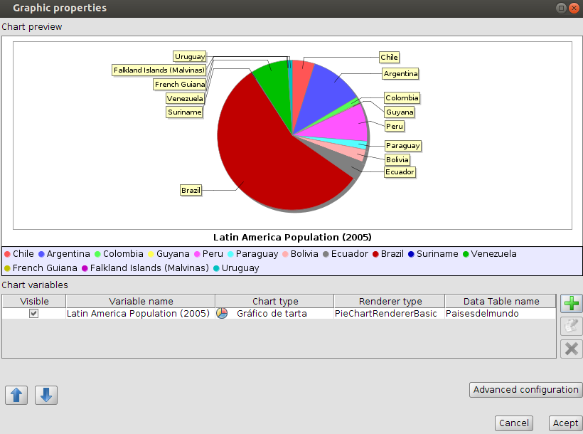 charts3The next example is about a pie chart. In the “Data Source” next tab select the table and the data fields to be used for the chart. In this case we will use as Tags the NAME field (which contains the name of each country) and for numerical values the POP2005 field (which has information about the population of these countries updated to 2005). We should activate the tab “Use only selected fields”.charts4In the last tab we will be able to set the “chart format” by selecting the following properties such as background color, contour or size.