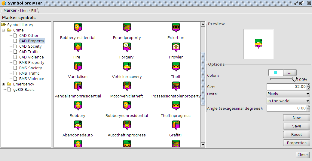 Some weeks ago we published a symbols library oriented to emergency management, both at a urban level and a natural disaster level. As a complement and in order to ease the representation of symbols for those gvSIG users who are related with criminology and delictual analysis, we have created a new symbols library.