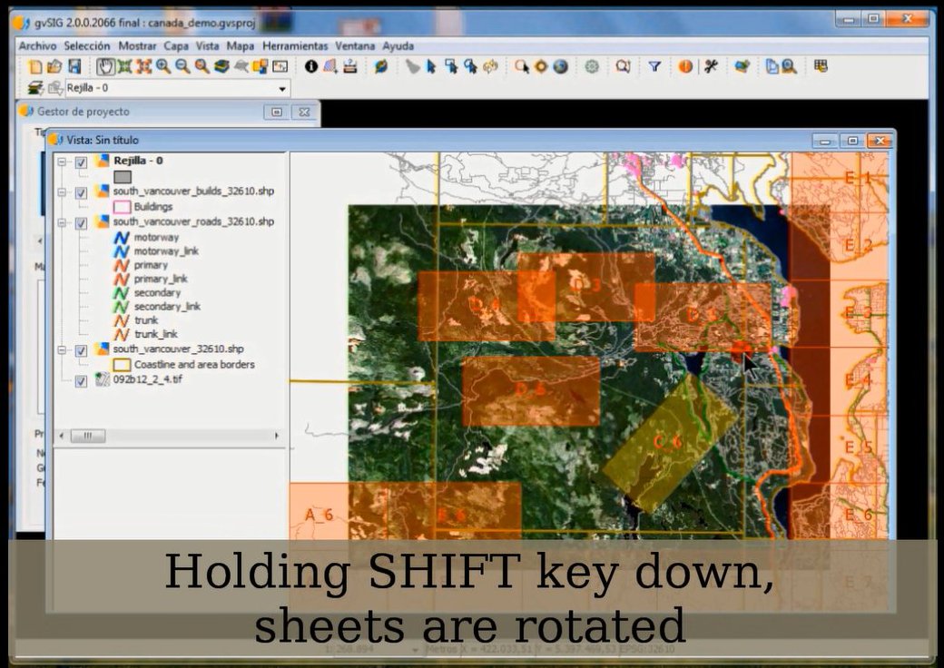 The Map Sheets plugin for gvSIG 2.0 has just been released (read official announcement here). This plugin allows the user to create and print map series covering a certain area of interest. Each resulting sheet will have its particular values for certain fields. This new version of the plugin also allows each sheet frame to be rotated, which means that the top margin will not necessarily be the North:
