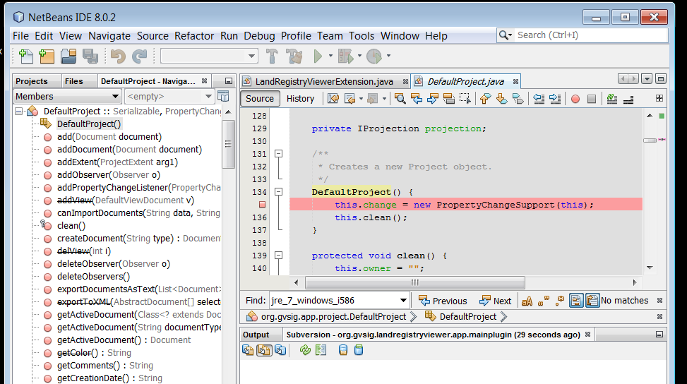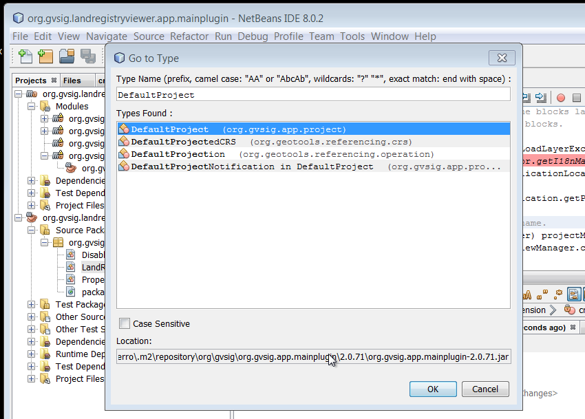 If we need to see the code of gvSIG, we click on Ctrl-O and type the class name which we want to locate.For instance, if wew want to put a breaking point in the proect creation, we will type Ctrl-O y “DefaultProject” …
