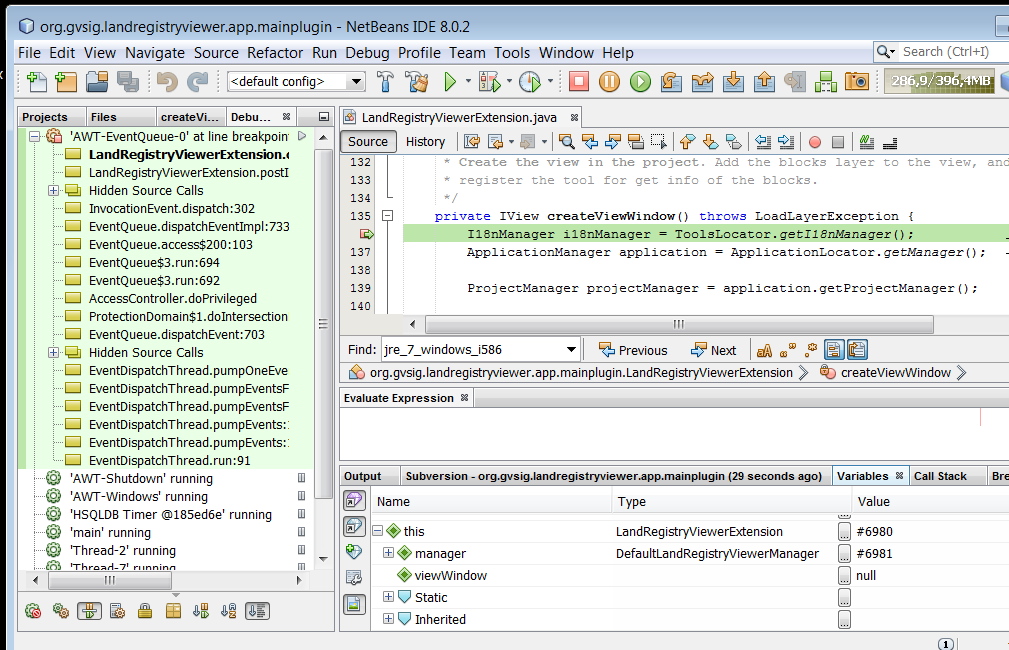 When click on “OK”, it will carry on with the running of gvSIG in debug. As we have put a breaking point, it will stop on it and we will be able to debug our plugin.
