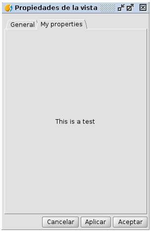 - El valor de retorno de getGroupID debe corresponderse con el diálogo al que queremos añadir nuestra pagina de propiedades. Si retorna ViewDocument.VIEW_PROPERTIES_PAGE_GROUP, se añadirá al diálogo de propiedades de la Vista, pero si, por ejemplo, quisiésemos añadir nuestra página al diálogo de propiedades del proyecto retornaríamos Project.PROJECT_PROPERTIES_PAGE_GROUP.
