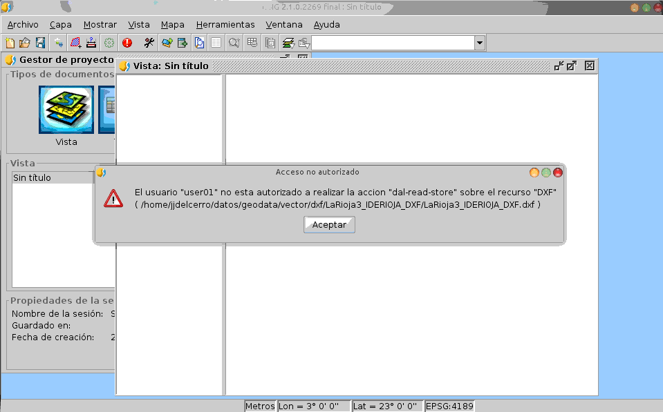 Con la configuración que hemos visto el usuario  user01 no podrá cargar ficheros DXF ni podrá acceder a la herramienta de información.