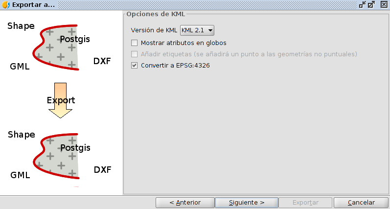 En la primera ventana del asistente, seleccionaremos el formato KML como formato de exportación.