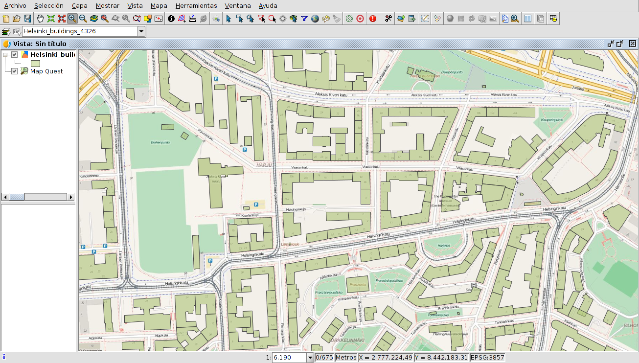 Finalmente se dispondrá de la capa cargada, sobre la cartografía de OpenStreetMap, en su posición correcta.