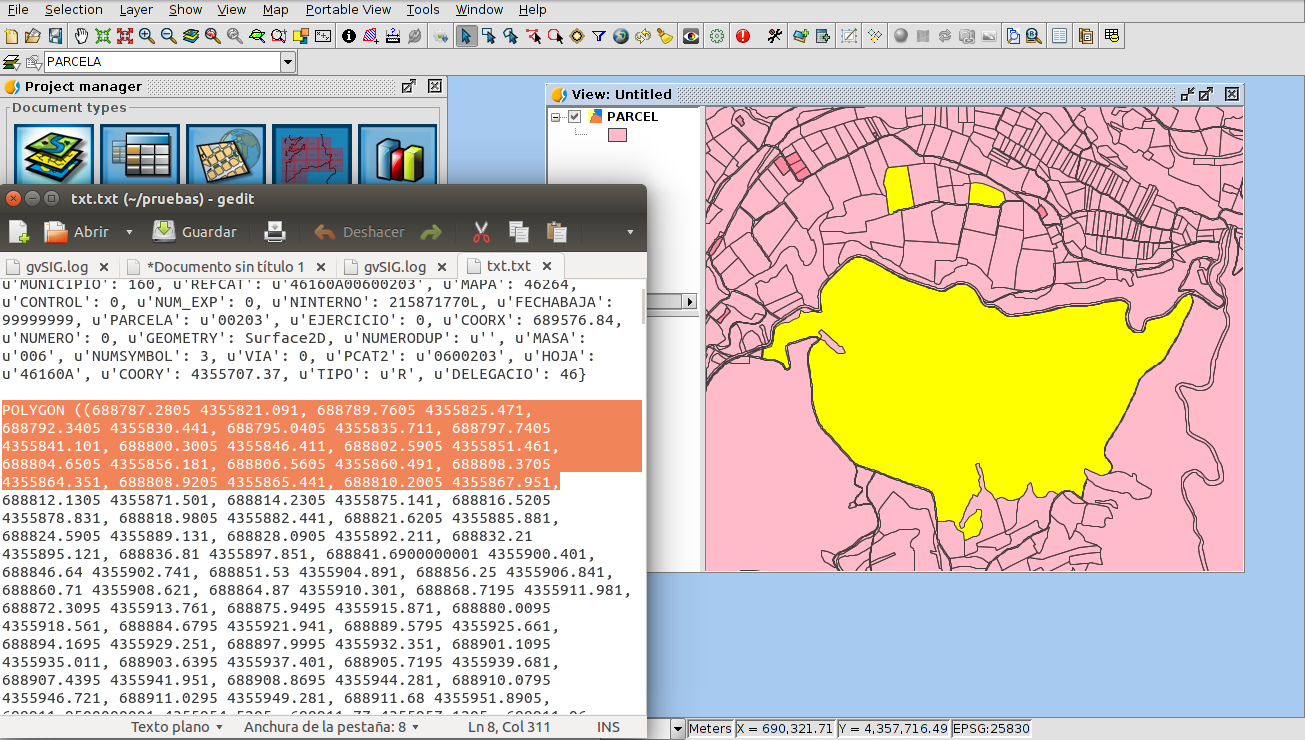 We can get the coordinates of the vertexes of one or more parcels in an easy way in gvSIG through scripting.