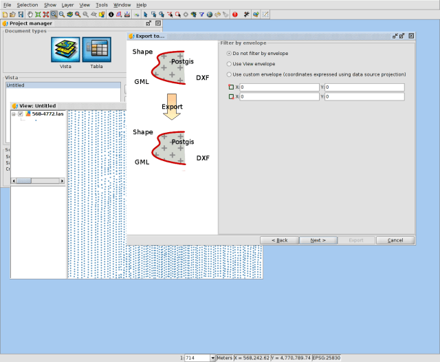 In gvSIG 2.3 users will be able to access a new source of data that has been using more and more, the LiDAR data. gvSIG 2.3 drivers provide to read and write LiDAR in gvSIG according to LAS specification. A cropping tool will be also provided to export a subset of LIDAR data.