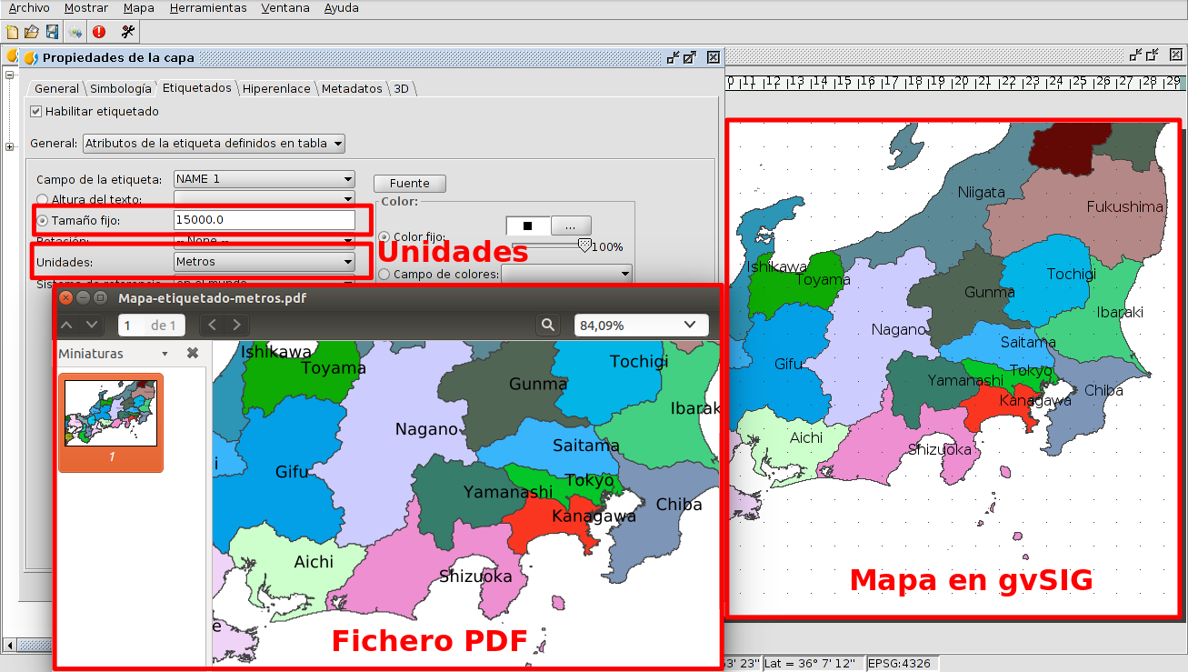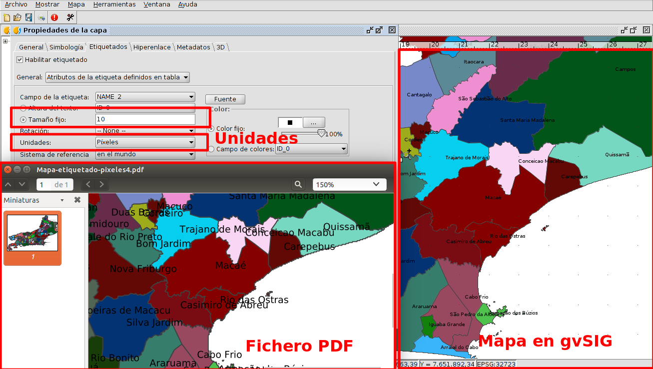 Cuando creamos un mapa en gvSIG, y luego lo exportamos a formato PDF o lo imprimimos a papel, en ocasiones vemos que las etiquetas que habíamos insertado en los elementos del mapa nos aparecen en el papel o en el PDF en un tamaño distinto. Podemos ver el etiquetado de forma correcta en el mapa de gvSIG, sin superponerse, pero después en el papel o el PDF se superponen entre ellos o directamente no se visualizan porque quedan demasiado pequeños.