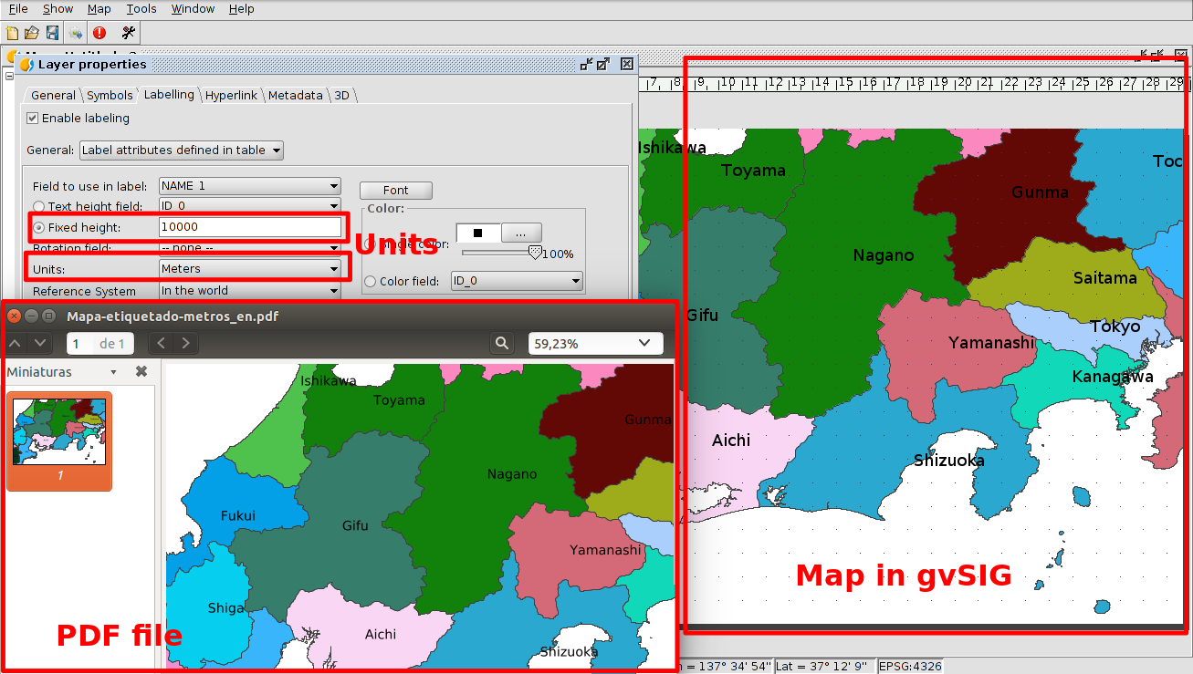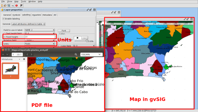 When we create a layout in gvSIG, and we export it to PDF format or we print it, we sometimes can see that labels that we had added to the different elements of the map appear in a different size at the PDF file or in the paper. We can see the labeling in a correct way at the gvSIG layout, without being overlapped, but they are overlapped or they are not visualized because they are very small at the PDF file or at the paper.