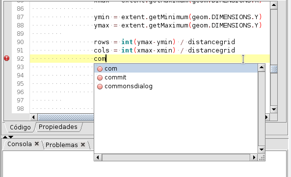 Herramientas de autocompletado básico, con variables de nuestro script, indicador de funciones de gvSIG con el mismo nombre, librerías, etc. Se lanza al presionar CONTROL+ESPACIO mientras escribimos código.
