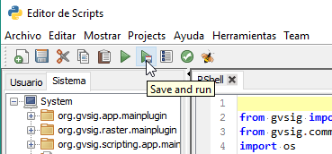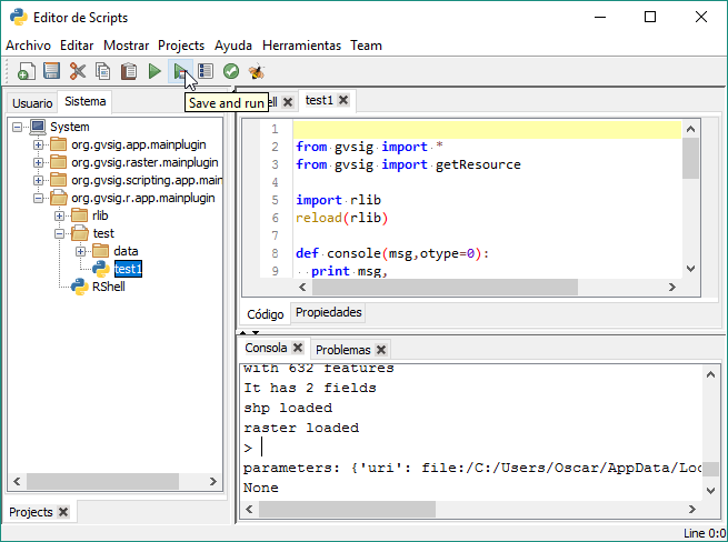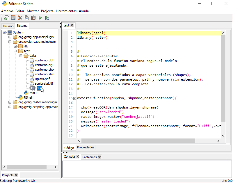 Este script lo que está realizando es la ejecución de un script en R que tenemos en la carpeta /data/ y que también podemos editar desde gvSIG: