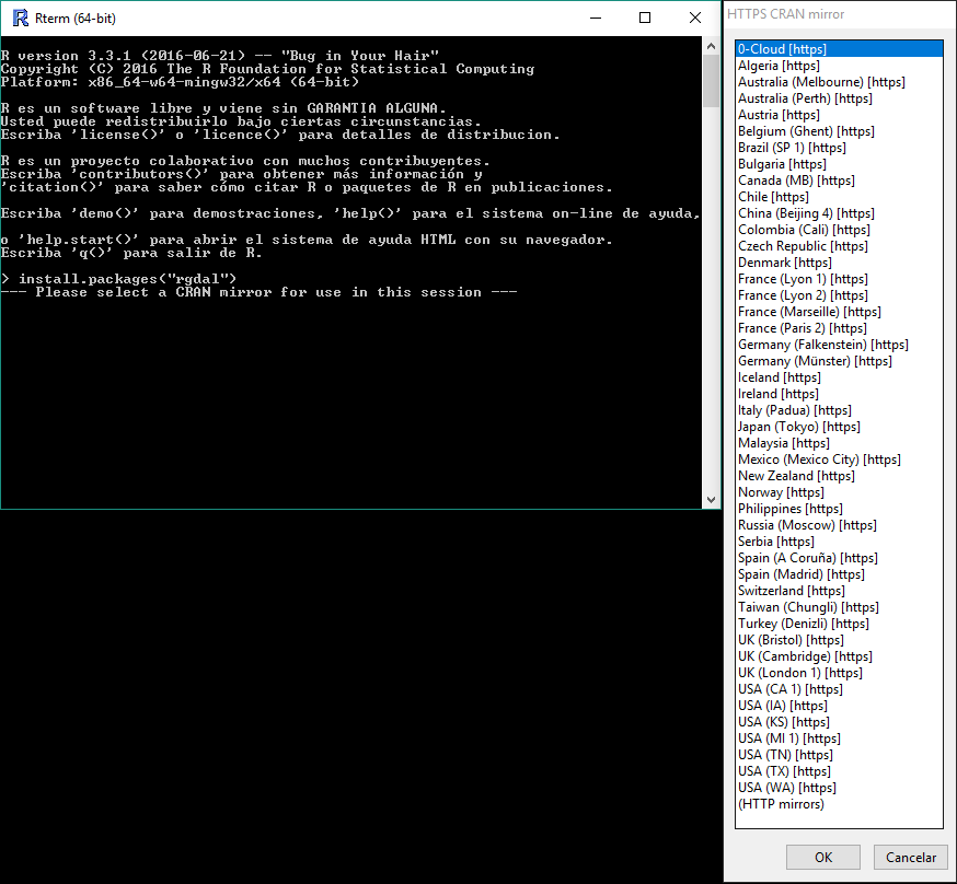 Right now we recommend to use the extension in Windows, because in this platform the library installation is easy to do inside R. We also put in some pre-installed packages with the main libraries in the geospatial R world. However, you also can use this extension in Linux, following the same steps except the library installation.