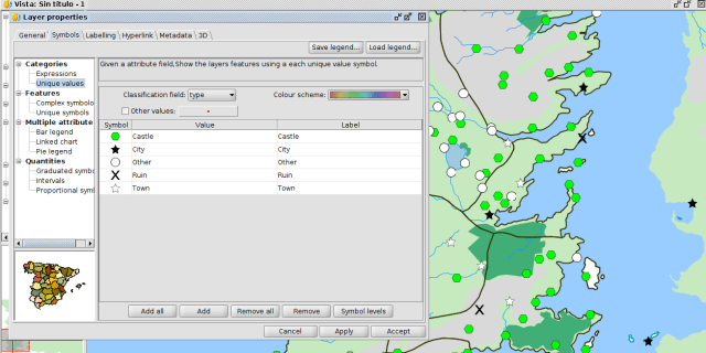 In this case we are going to select a legend about “Categories/Unique values”. This type of legend is used to assign a symbol to each unique value specified at the attribute table of the layer. Each element is drawn depending on the value of an attribute that identifies the category. In our case we will select “Type” for classification field; we press “Add all” and it will show the legend created by default: