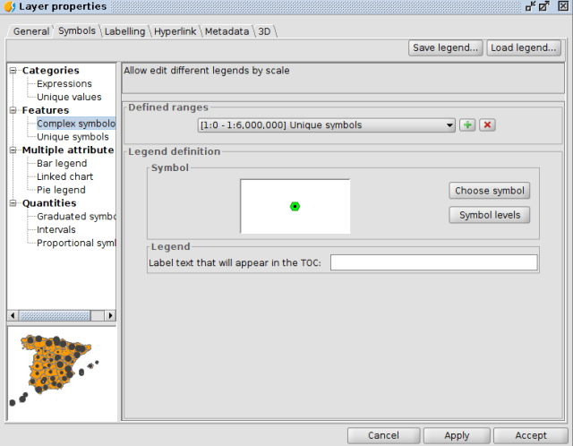 Now we access to the “Symbology” tab and a window is shown with the symbology applied. At the left side we can find all the types of symbols than we can use. Warning: Depending on the type of layer (point, line or polygon) we can find different legends available.