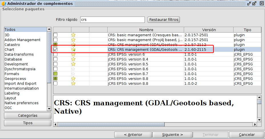 - En el listado de complementos buscaremos “CRS: CRS management (GDAL/Geotools based, Native)”, build 2.1.60-2115. Lo marcaremos y le daremos a “Siguiente”.