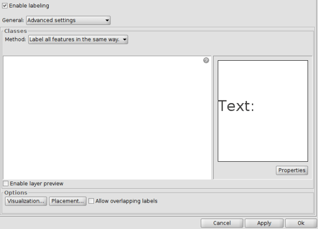 If we want to have more control over the labels, we should pick the option “User defined label“ in the “General” drop-down menu, instead of the “Label attributes defined in table” that is shown by default. Then, in the “Classes” drop-down menu, we pick the option “Label features in the same way” in the “Method” option. The window changes as shown below: