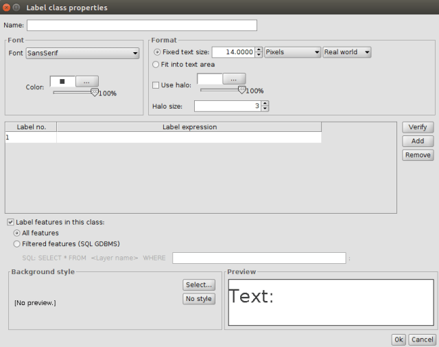 If we click on the “Properties” button, the “Label class properties” window is opened: