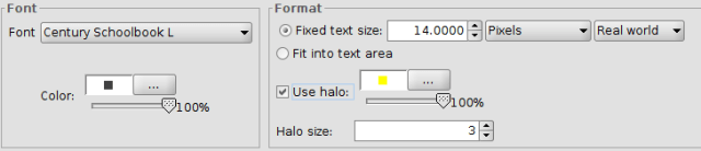 When you label a layer, you might want to modify the visualization of the labels. gvSIG, allows you to change some label properties, such as font, color, or size. This option is not available in the basic labelling options but only in the advanced options by checking the box “Use halo”. This enables you to choose the format and the font settings.