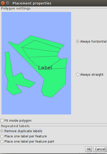 Once the label properties are defined, click on “OK” to close the “Label class properties” window. Now, back in the “Layer properties/Labelling” window, click on the “Placement” button to open the “Placement properties” window shown below: