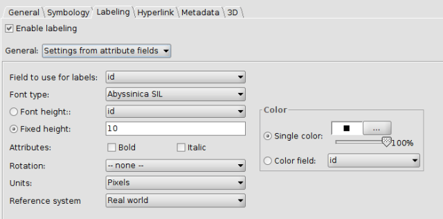 In the “Layer Properties” dialog box, click on the “Labelling” tab. Then, click on the “Enable labelling” check box to enable all the basic labelling options.