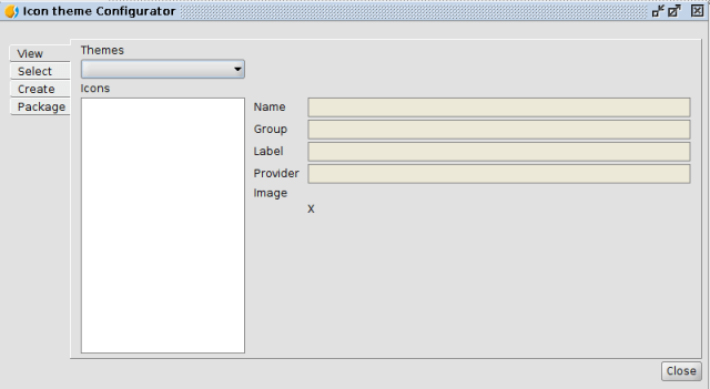 En la pestaña “Create” podremos exportar e una carpeta ubicada en “gvSIG/icon-theme” el juego de iconos interno de gvSIG Desktop. Deberemos indicar un código, nombre, autor y descripción. De estos campos los más relevantes son el código y nombre, siendo el código el nombre con el que creará la carpeta en “gvSIG/icon-theme”. Se recomienda que el código no contenga espacios ni caracteres especiales (sólo letras, números y guiones).
