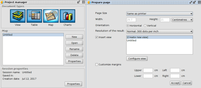 Once we have our project open in gvSIG, firstly we are going to open the “Project manager” window. A fast way to do it is through the “Show/Project manager” menu. We select the “Map” type of document and we press “New”. A new window will be opened, where we can define the characteristics of the Map page.