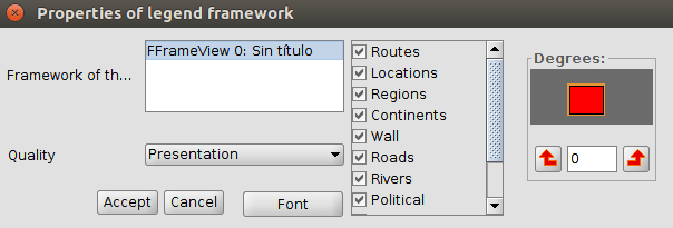 The legend is always associated with a View inserted in the Map and allows to represent the symbology of the different layers of that View. Once the tool is selected, we will indicate the first end of the rectangle defining the space to be filled by the legend. It will be indicated by clicking on the Map area at the desired location, and dragging until released at the opposite end. A dialog box will appear where you can define the graphic properties of the inserted legend: