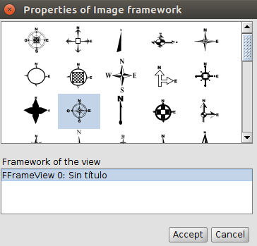 Once the tool is selected, the first end of the rectangle that defines the space to be occupied by the north symbol will be indicated by clicking on the Map area at the desired location, and dragging until released at the opposite end. A dialog box will appear where you can define the graphic properties of the inserted north: