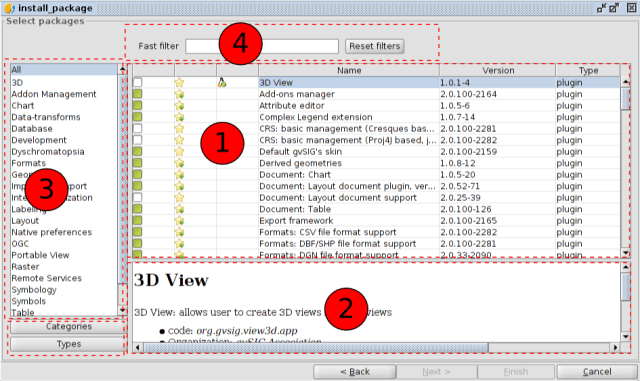 The add-ons manager is a tool that allows to customize gvSIG, installing new extensions, functional ones as well as other types (symbol libraries). It can be run from the “Tools/Add-ons manager” menu, although it can be accessed during the installing process.