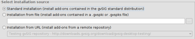 From URL. Through an internet connection we can access to all the add-ons available at the gvSIG server and install those that we need. It’s the recommended option when we want to consult all the add-ons available.