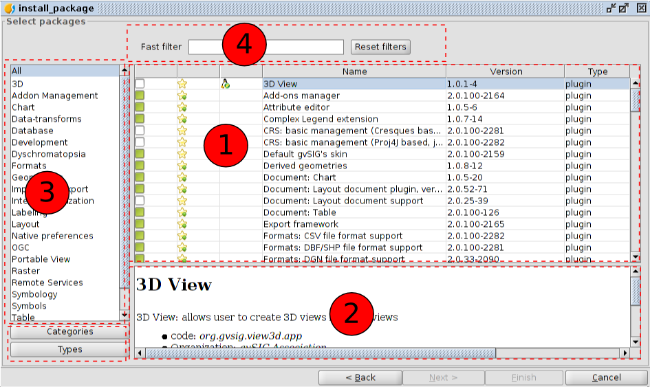 The add-ons manager is a tool that allows to customize gvSIG, installing new extensions, functional ones as well as other types (symbol libraries). It can be run from the “Tools/Add-ons manager” menu, although it can be accessed during the installing process.