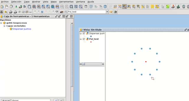 Tal y como indica la ayuda de gvSIG: este geoproceso permite dispersar los puntos de una capa que se superponen alrededor de un punto central. Dada una capa de puntos, una distancia de concordancia y un radio de dispersión, este algoritmo recorre la capa de origen buscando grupos de puntos cuya distancia sea menor o igual a la distancia de concordancia y los dispersa, según el radio de dispersión, alrededor del centro de dicho grupo, generando una nueva capa de puntos con el resultado.