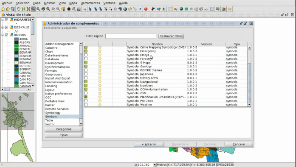 Aparte, si se publica una nueva extensión de gvSIG o librería de símbolos tras la publicación de una versión final no hace falta esperar a la siguiente versión para poder disponer de ellas. Con el Administrador de complementos tenemos la posibilidad de conectar al servidor e instalarlas.