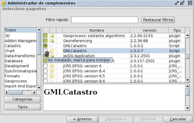 Presionando todo siguiente y dando al botón de comenzar instalación, se instalará la actualización. Para que todo funcione correctamente deberás de cerrar y abrir gvSIG de nuevo.
