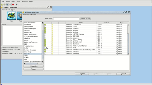 Besides, if a new gvSIG extension or symbol library is published after the final version release, it is not necessary to wait for the next version to be able to use them. With the Add-ons Manager we have the possibility to connect to the server and install them.