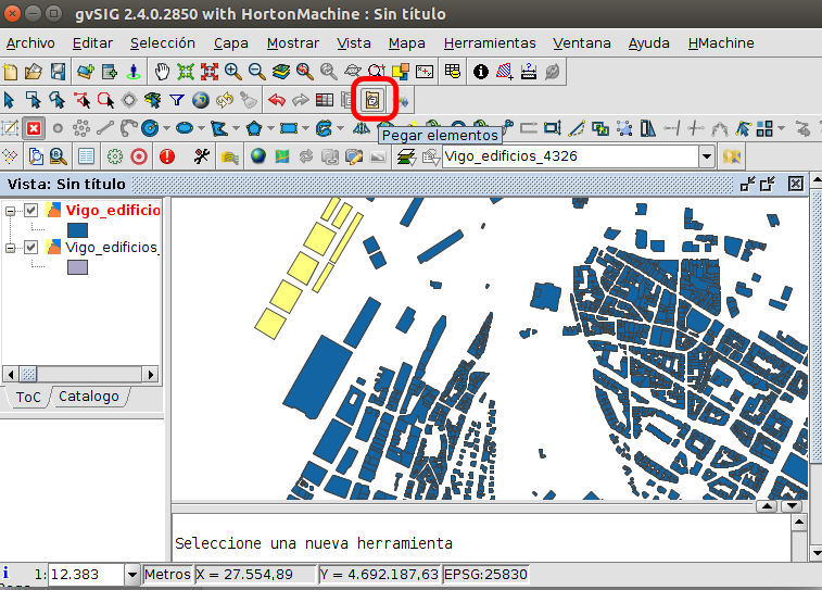 El siguiente paso será poner en edición la capa destino, y seleccionaremos la herramienta de “Pegar elementos” (también disponible en el menú Capa->Modificar).