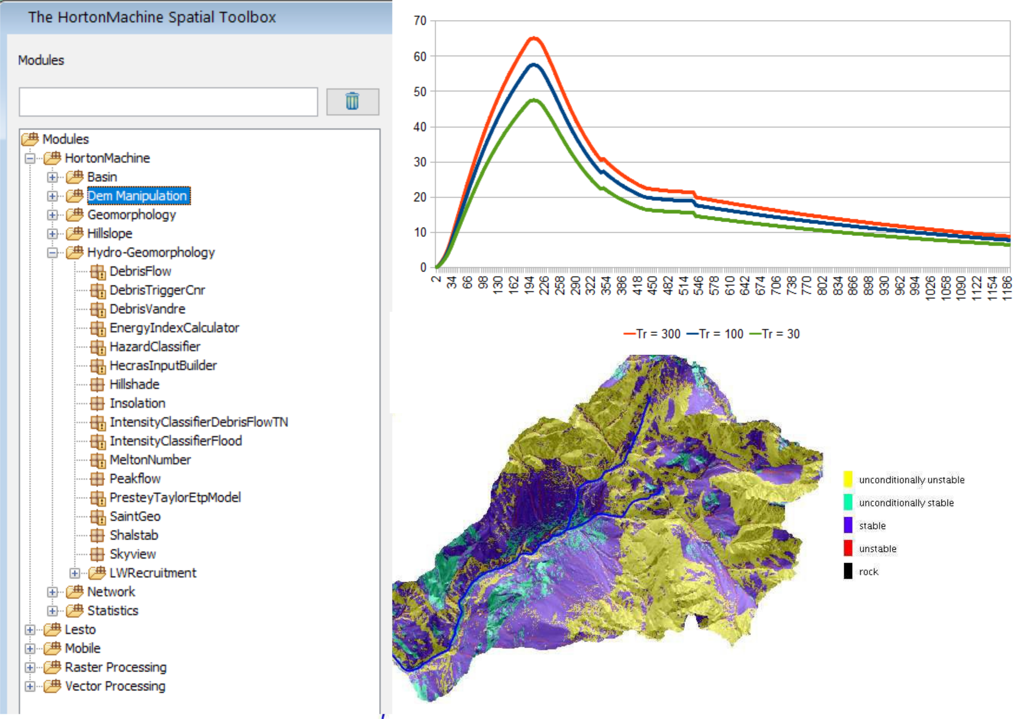 The tools aim to the evaluation of different environmental variables (rainfall, discharge, biomass, hillslopes stabilities, …) mainly starting from a digital elevation model (DEM). These tools are classified into 7 different sections, from data management (raster, vector and point cloud), data collection in the field, and environmental modelling in particular related to hillslope stability, floods, debris flow and transportation of wood during flooding events.