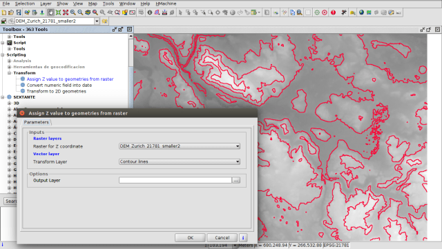This new functionality allows to convert a 2D vector layer into a 3D layer, taking Z coordinates from a Digital Terrain Model on the same area, and assigning them as Z coordinate to the elements of the vector layer. The vector layer has to be a shapefile (it works on points, lines and polygons).
