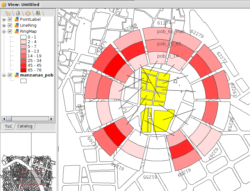 En el siguiente ejemplo, vamos a ver una capa que contiene la población en diferentes campos de la tabla de atributos, para visualizarlo generaremos un mapa de anillos que dará como resultado algo similar a la imagen de a continuación. De esta forma podemos ver de un vistazo rápido como se distribuye la población en diferentes franjas de edades sobre una zona del mapa.