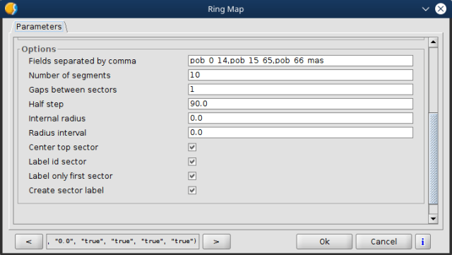 Los campos a mostrar deberán ser escritos por orden en que queremos que se muestren. También disponemos de muchas opciones de configuración para la creación de los anillos. Desde posición de los sectores, espacio entre ellos, tamaño del circulo interior, del grosor de cada sector, creación de etiquetas..