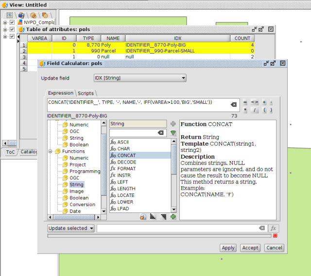 For example, we can create an unic identifier in this table. It will add multiple field as text and then it will add at the end a text:BIG if the area of the geometry is bigger than 100, or SMALL if is smaller.