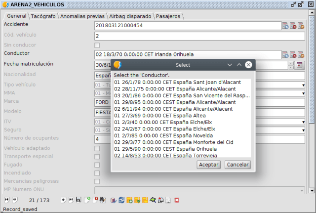 We can create relations 1 to 1. In the field of one feature in one table you create a relation to other one feature in other table. In this example you can se how the field Conductor makes reference to other table where you see all the features related to this field.